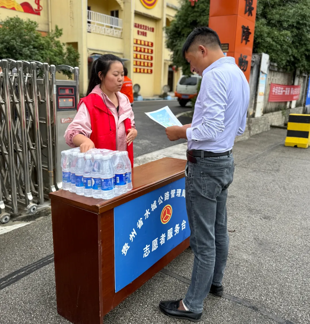 志愿者们向过往的司乘发放《国庆安全出行倡议书》、公路安全保护宣传册、公路出行服务指南等,耐心讲解超速、超载、疲劳驾驶等交通违法行为的危害性,解答了高速公路免通政策、热门旅游景点路线及绕行方案,并为过往司乘提供了饮用水。