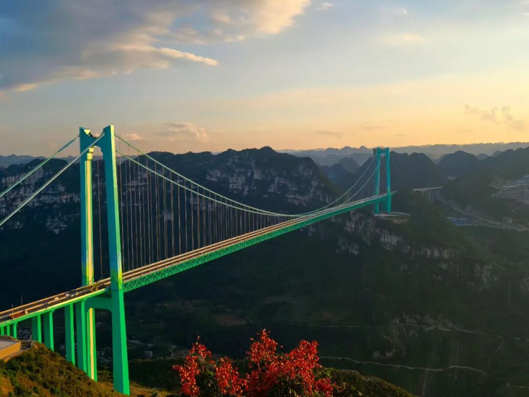花江峡谷大桥全长2890米、主跨径1420米,桥面距水面垂直高度达625米,是目前世界山区峡谷第一大跨度钢桁梁悬索桥,被誉为“横竖都是第一”。建设期间,花江峡谷大桥在抗风设计、高空施工等领域实现多项技术突破,创新采用智能缆吊系统、2000兆帕级高强钢丝等先进技术,累计获得授权专利21项,索股中植入的智慧缆索可实时感知桥梁健康状态,多项技术纳入国家桥梁建设标准,为全球山区桥梁建设提供“中国方案”。建设中还通过无人机航测、建筑垃圾再生利用、安装风光互补照明系统等举措,实现项目建设与生态环境保护相协调。通车后将把两岸通行时间从2小时缩短至2分钟,为安顺旅游发展按下“加速键”。