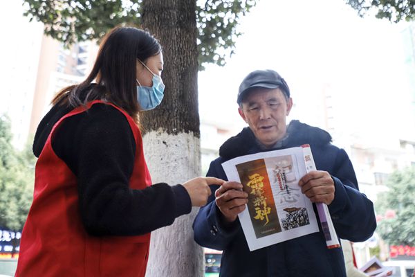 向行人发放雷锋精神宣传单(卢昌跃 摄)