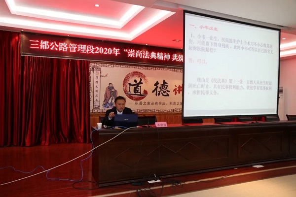 此次道德讲堂由三都县委党校讲师韦学精主讲,他精心筛选《民法典》中与群众日常生产生活息息相关的法律知识,按照“人生之初”、“成年之后”、“成家置业”、“养老继承”等人生各个阶段所享有的民事权利和承担的民事义务,以现实生活案例和工作案例引入讲解,把民法典的特征与亮点等一些与现实生活、工作息息相关的法律问题,深入浅出的进行系统讲解,帮助职工有针对性的理解法律规定。随后,组织全段职工观看庭审“张飞诉开阳县公安局交警大队不履行法定职责案”。