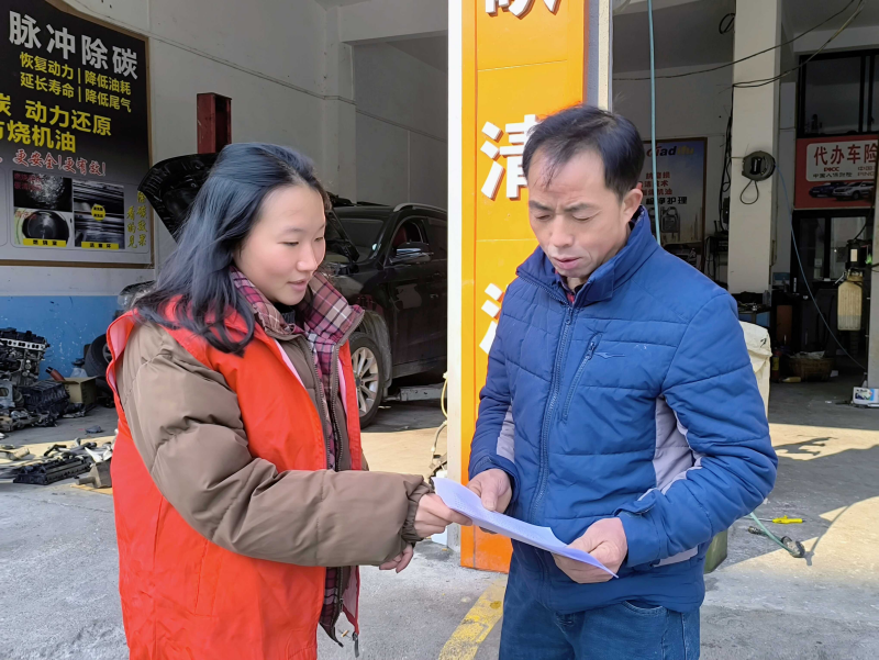 向群众发放宣传单。