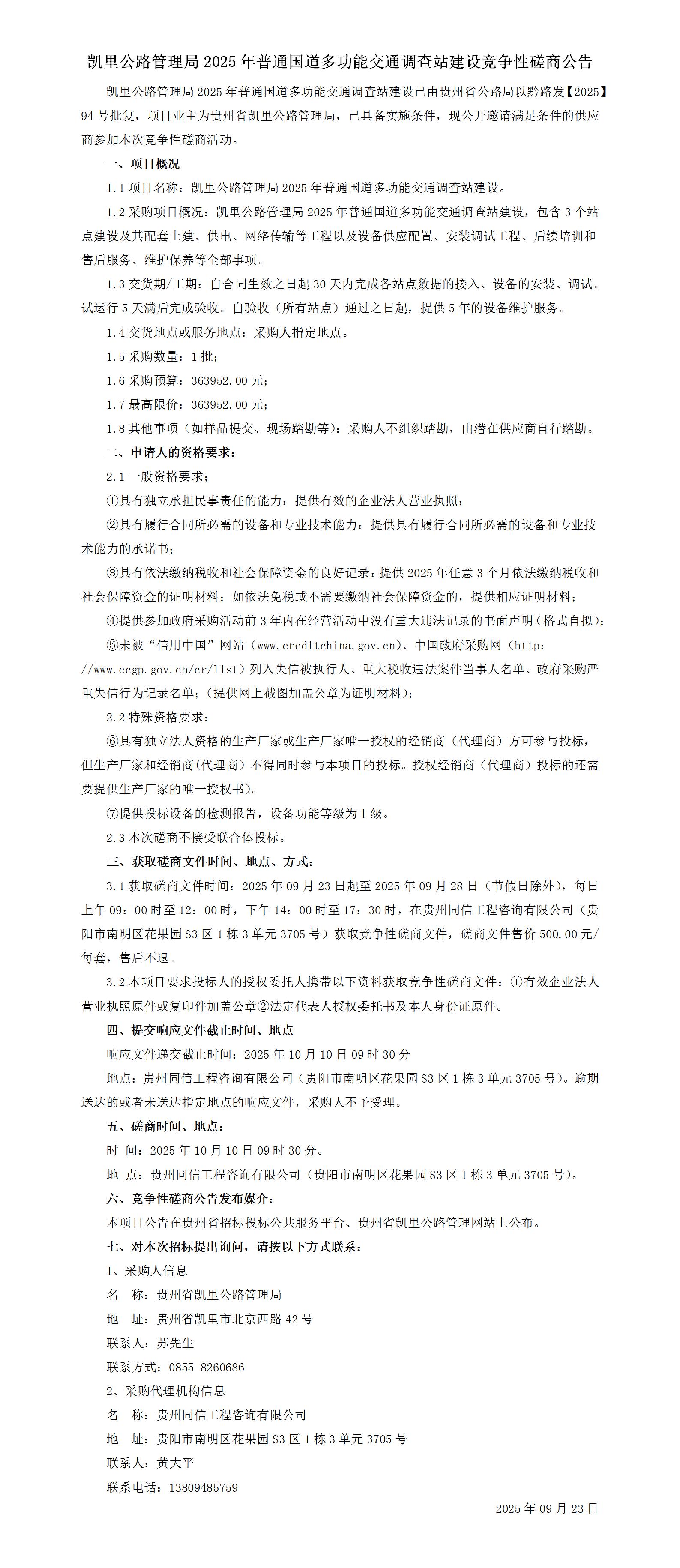 凯里公路管理局2025年普通国道多功能交通调查站建设竞争性磋商公告