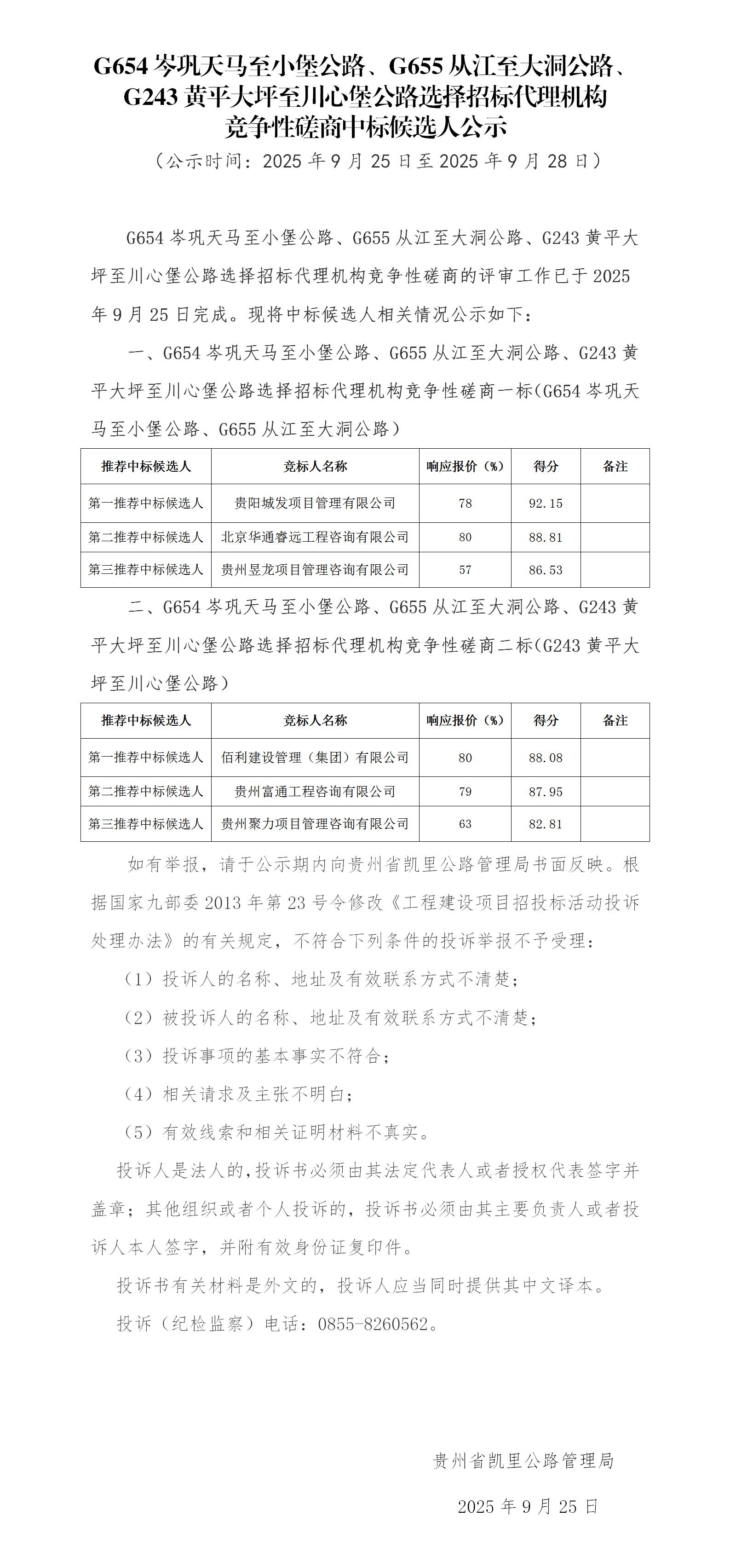 G654岑巩天马至小堡公路、G655从江至大洞公路、G243黄平大坪至川心堡公路选择招标代理机构竞争性磋商中标候选人公示