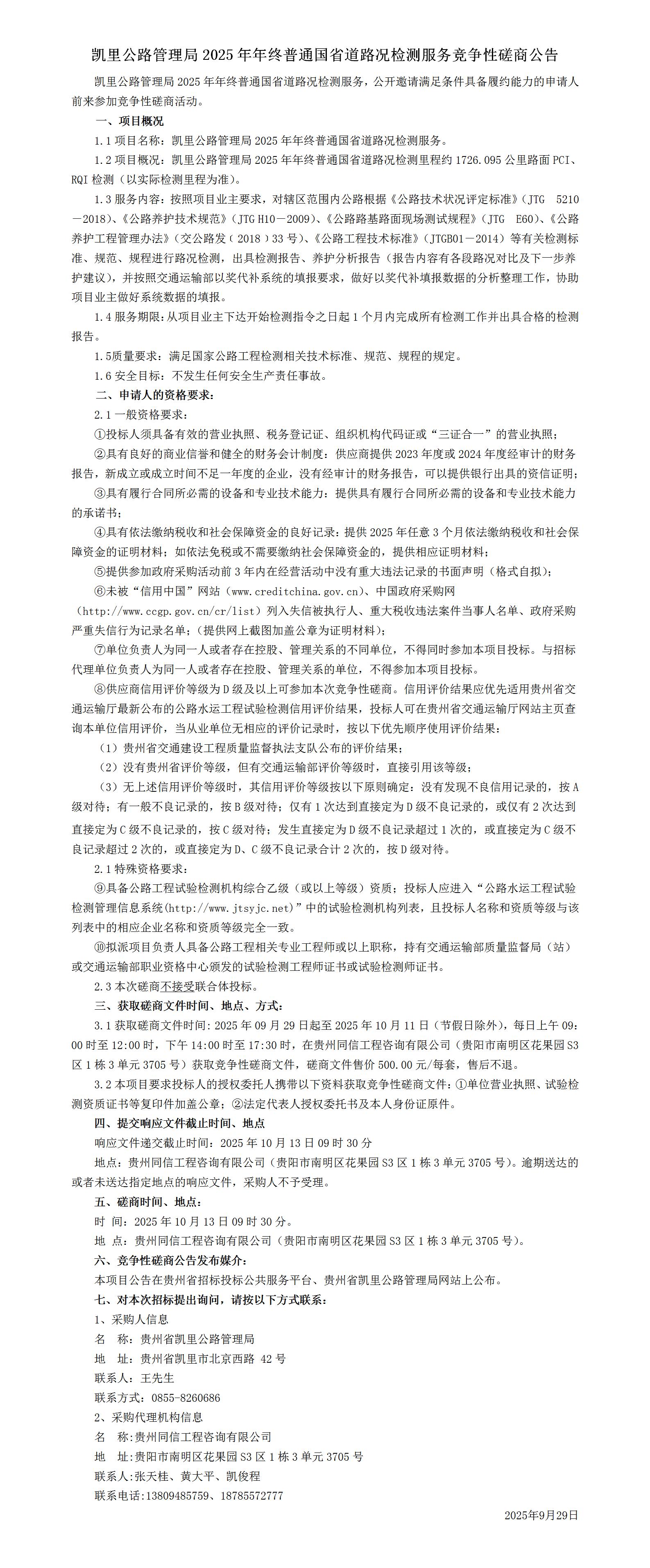 凯里公路管理局2025年年终普通国省道路况检测服务竞争性磋商公告
