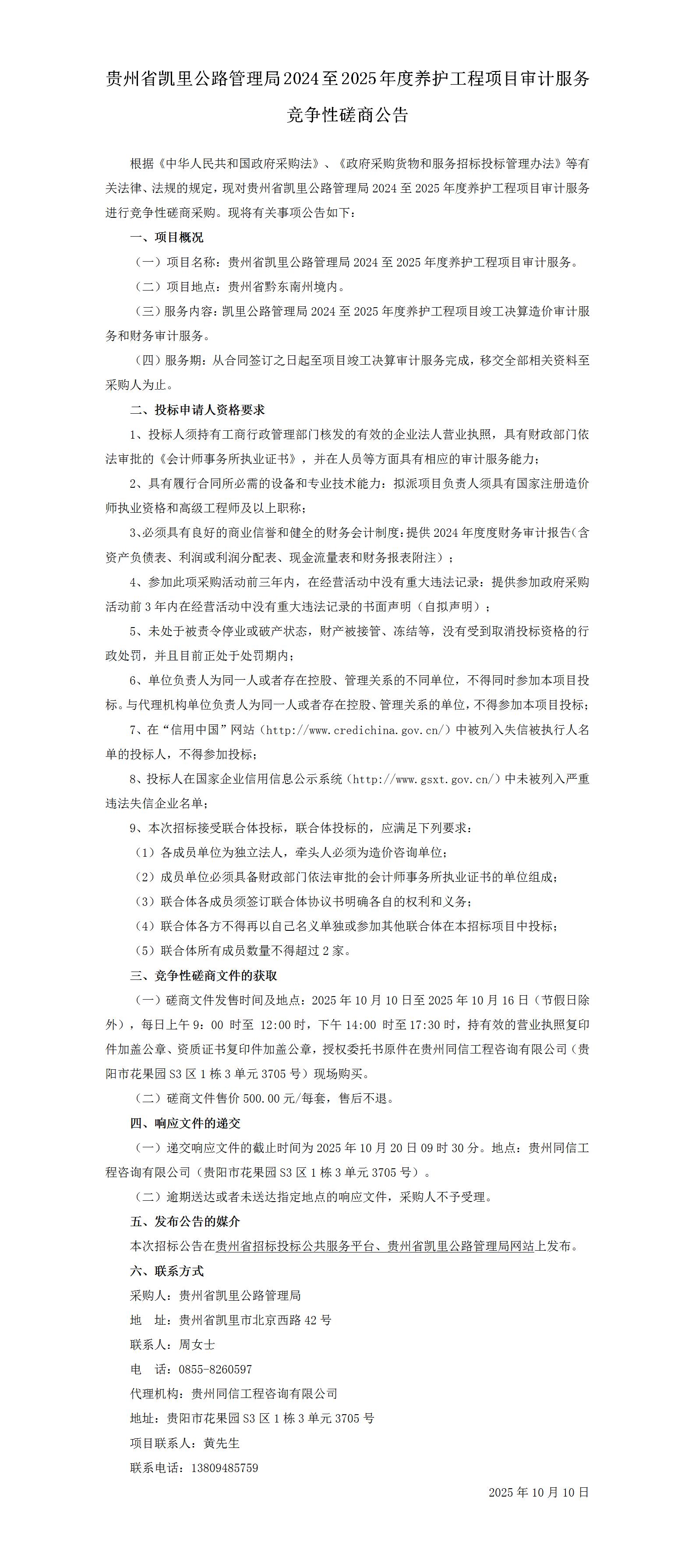 贵州省凯里公路管理局2024至2025年度养护工程项目审计服务竞争性磋商公告