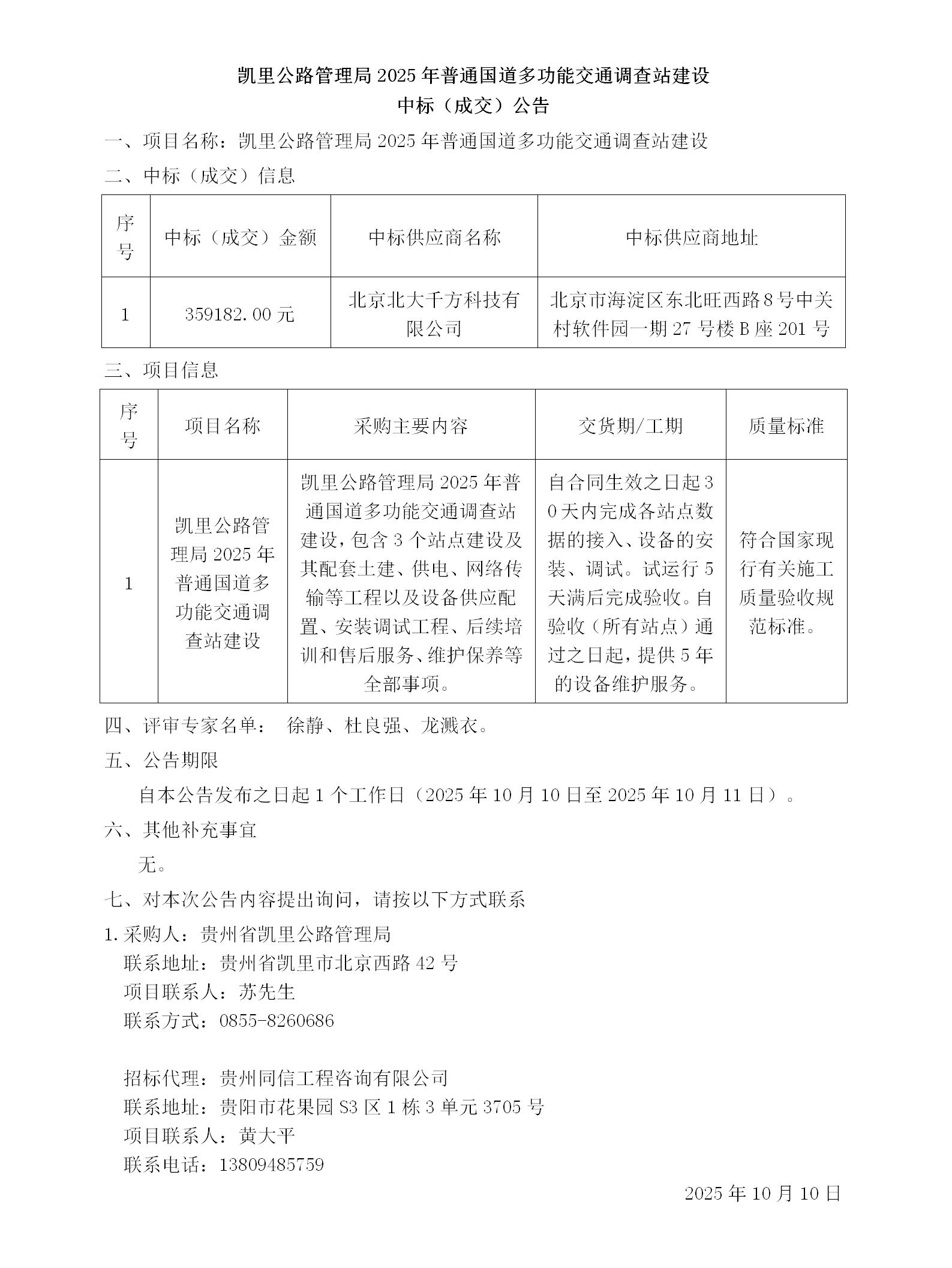 凯里公路管理局2025年普通国道多功能交通调查站建设中标(成交)公告