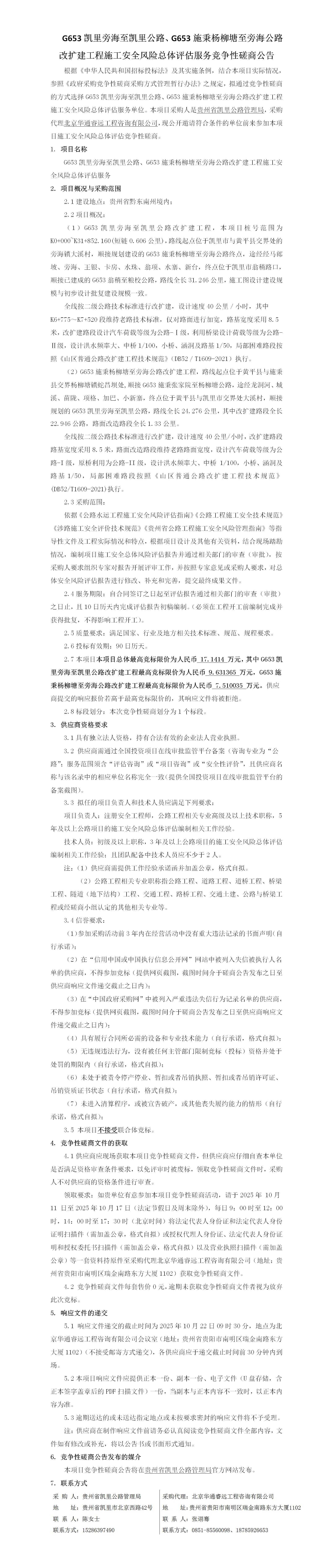 G653凯里旁海至凯里公路、G653施秉杨柳塘至旁海公路改扩建工程施工安全风险总体评估服务竞争性磋商公告
