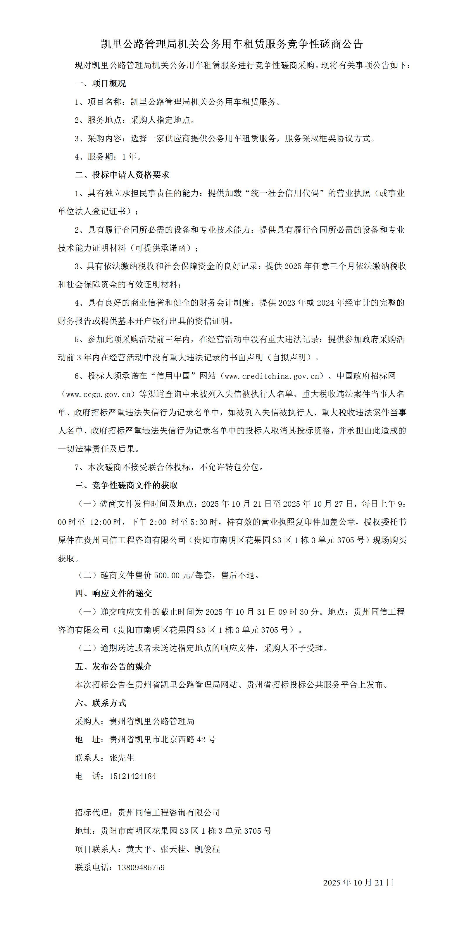 凯里公路管理局机关公务用车租赁服务竞争性磋商公告