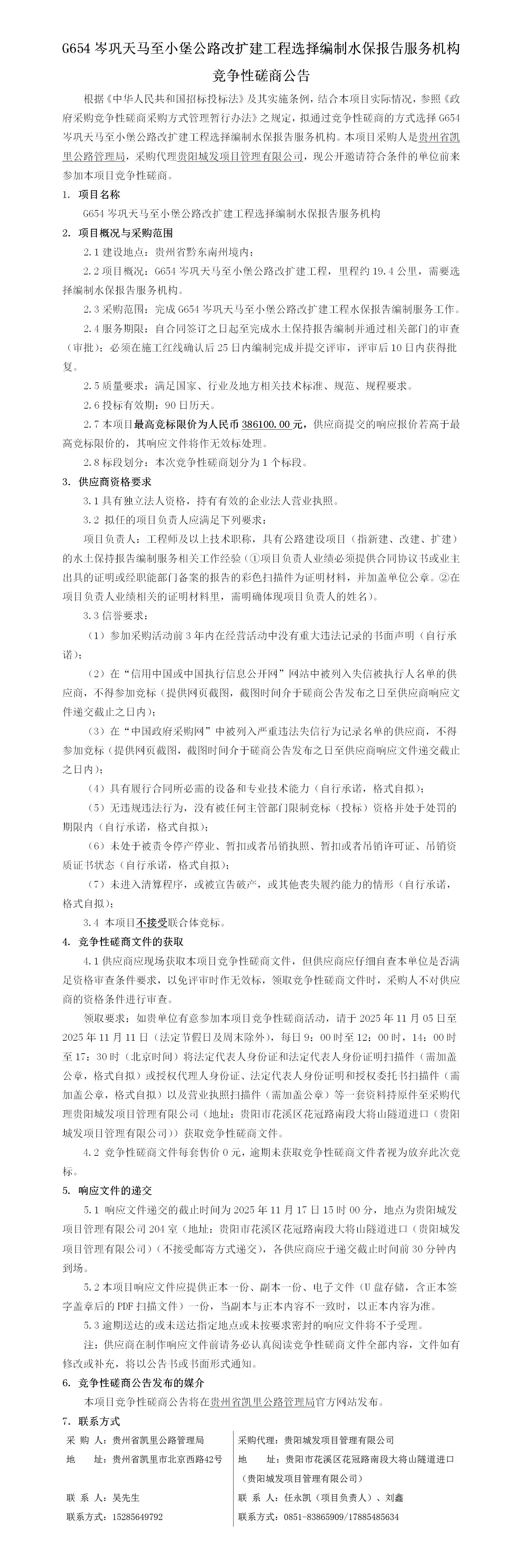 G654岑巩天马至小堡公路改扩建工程选择编制水保报告服务机构竞争性磋商公告