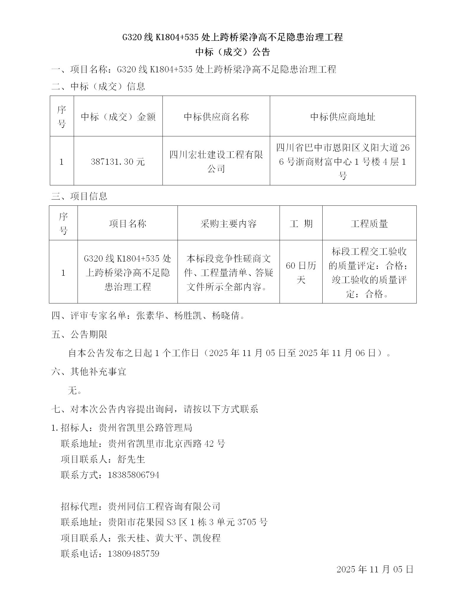 G320线K1804+535处上跨桥梁净高不足隐患治理工程中标(成交)公告