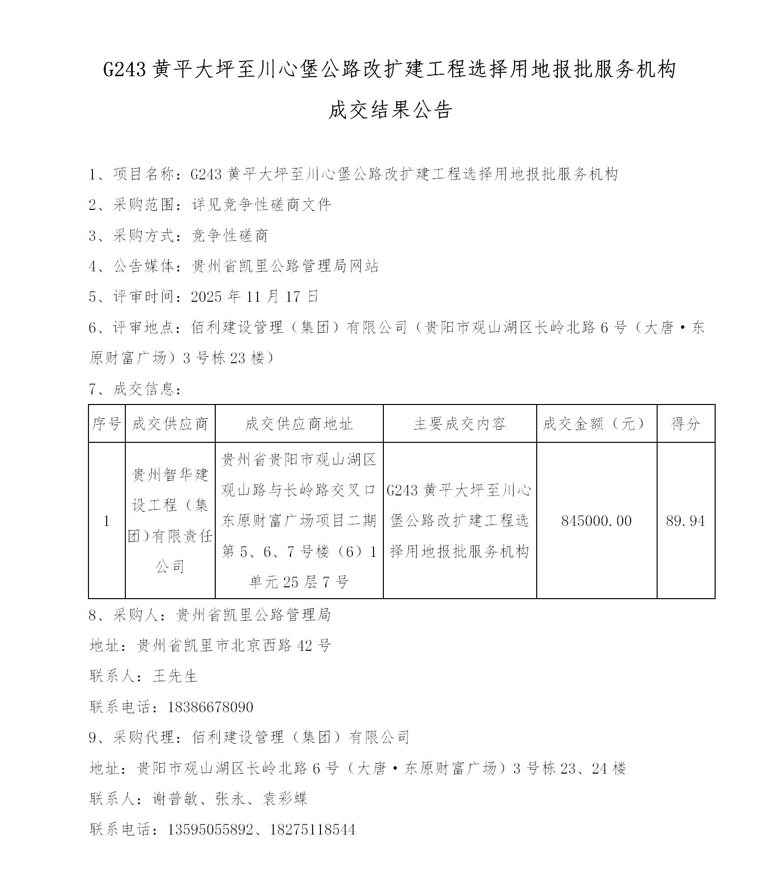 G243黄平大坪至川心堡公路改扩建工程选择用地报批服务机构成交结果公告