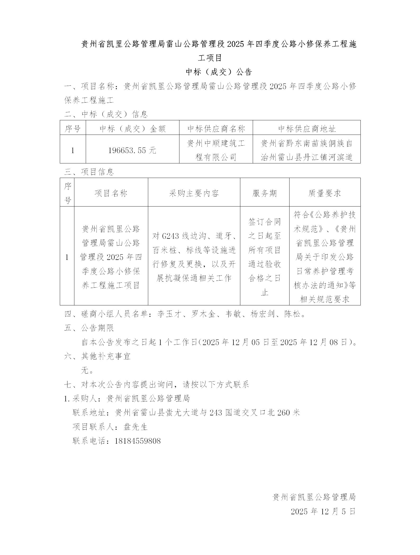 贵州省凯里公路管理局雷山公路管理段2025年四季度公路小修保养工程施工项目中标(成交)公告