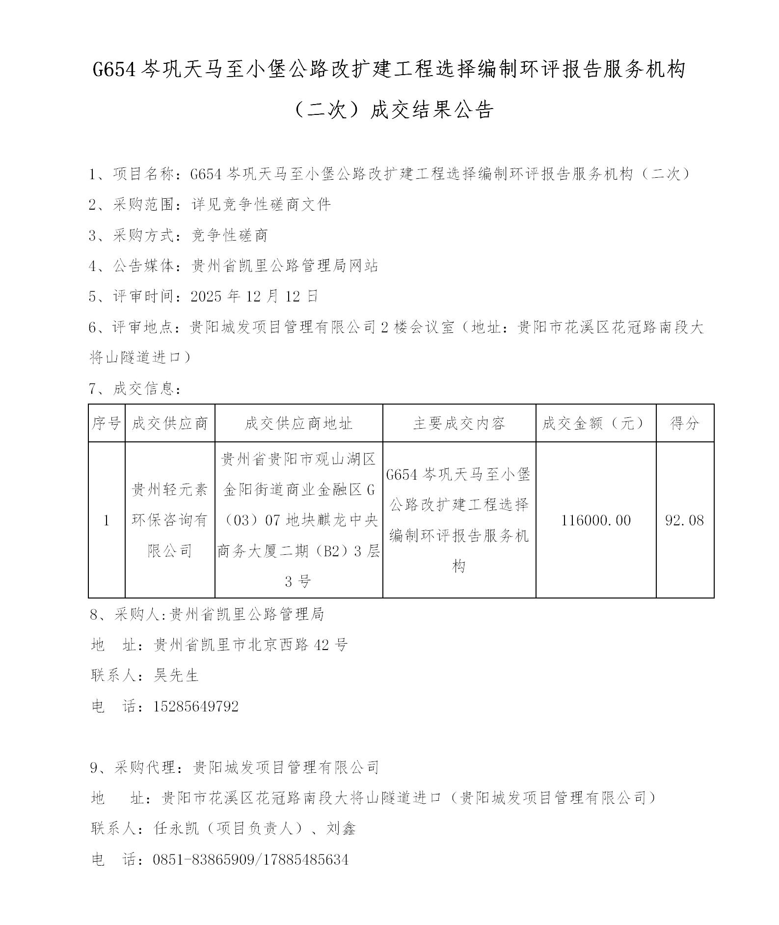 G654岑巩天马至小堡公路改扩建工程选择编制环评报告服务机构(二次)成交结果公告