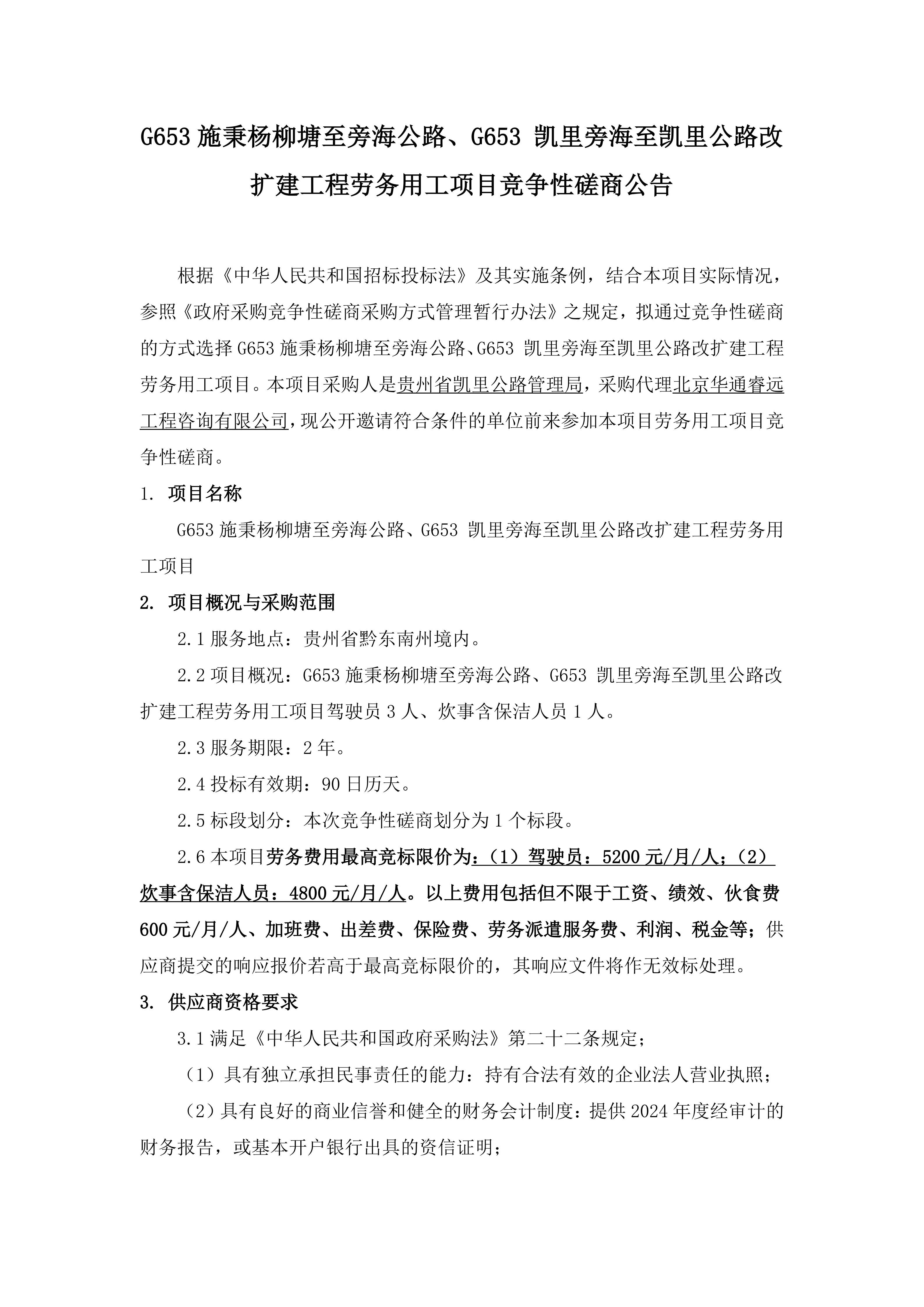 G653施秉杨柳塘至旁海公路、G653 凯里旁海至凯里公路改扩建工程劳务用工项目竞争性磋商公告