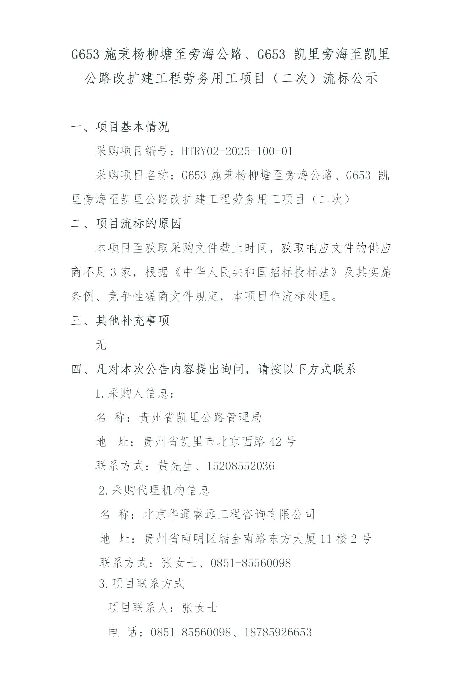 G653施秉杨柳塘至旁海公路、G653凯里旁海至凯里公路改扩建工程劳务用工项目(二次)流标公示