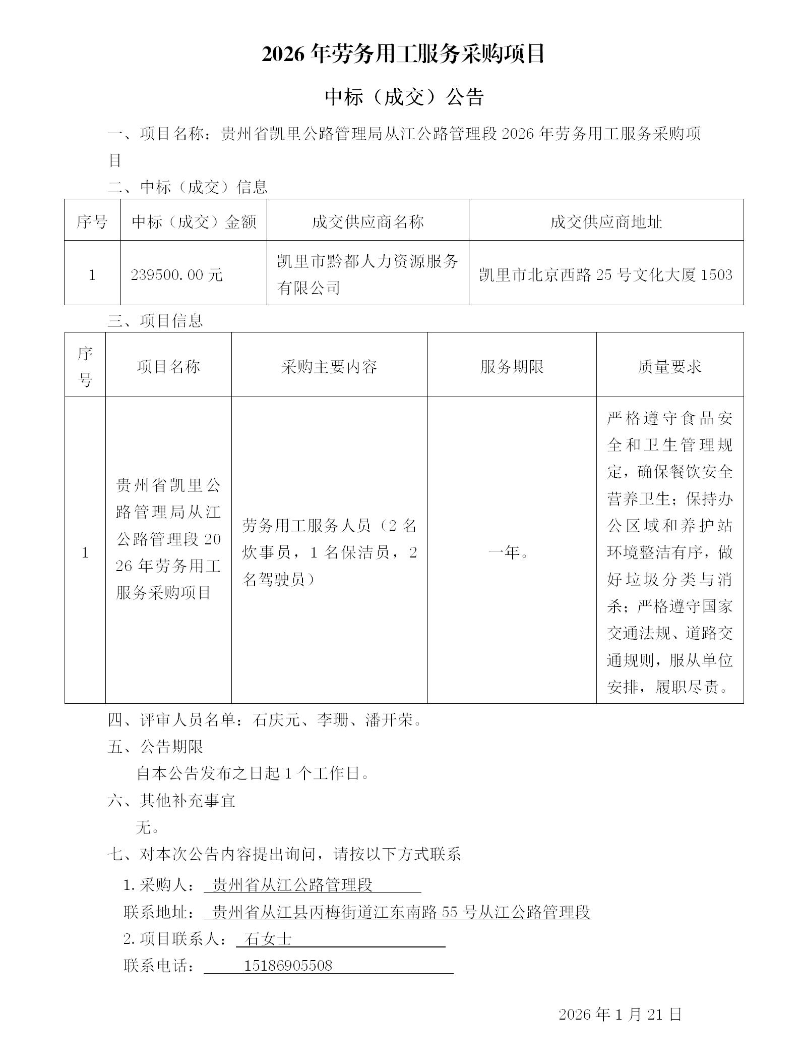 贵州省凯里公路管理局从江公路管理段2026年劳务用工服务采购项目中标(成交)公告
