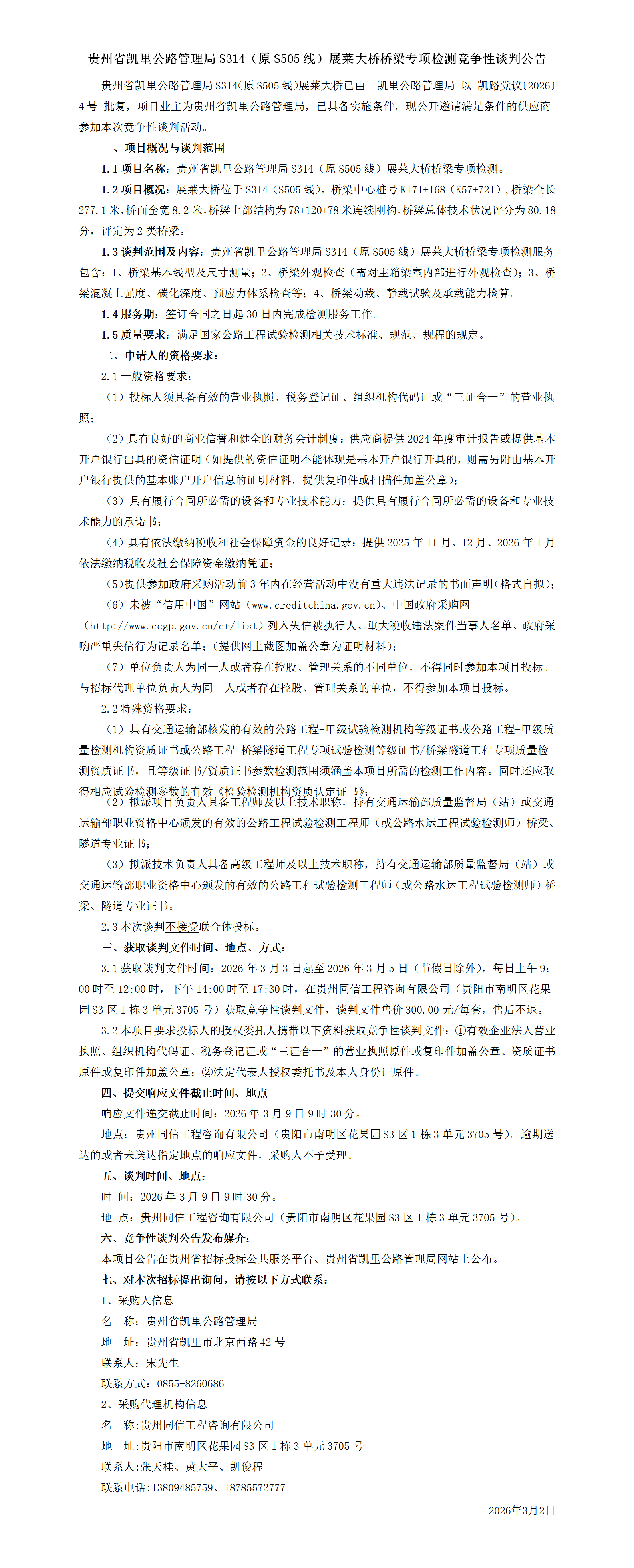 贵州省凯里公路管理局S314(原S505线)展莱大桥桥梁专项检测竞争性谈判公告