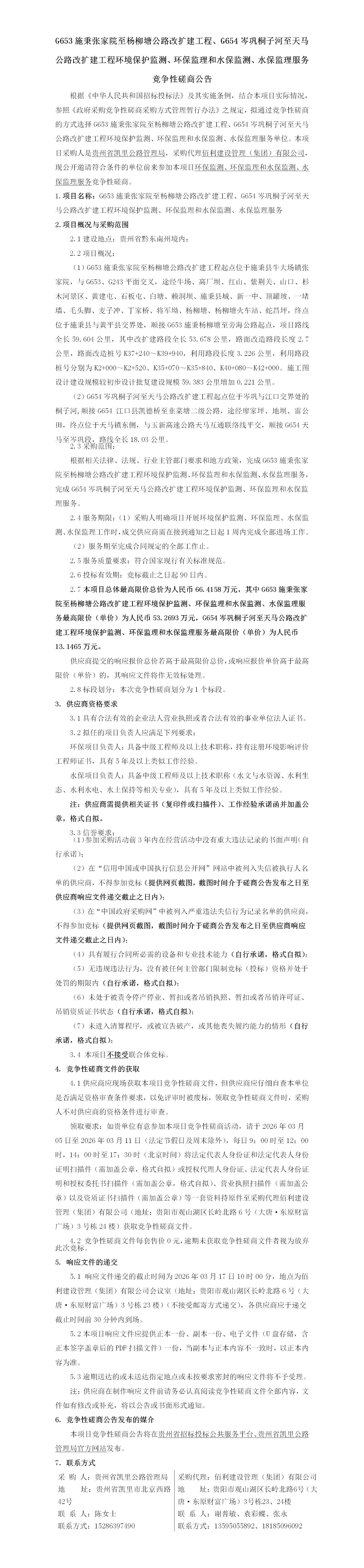 G653施秉张家院至杨柳塘公路改扩建工程、G654岑巩桐子河至天马公路改扩建工程环境保护监测、环保监理和水保监测、水保监理服务竞争性磋商公告