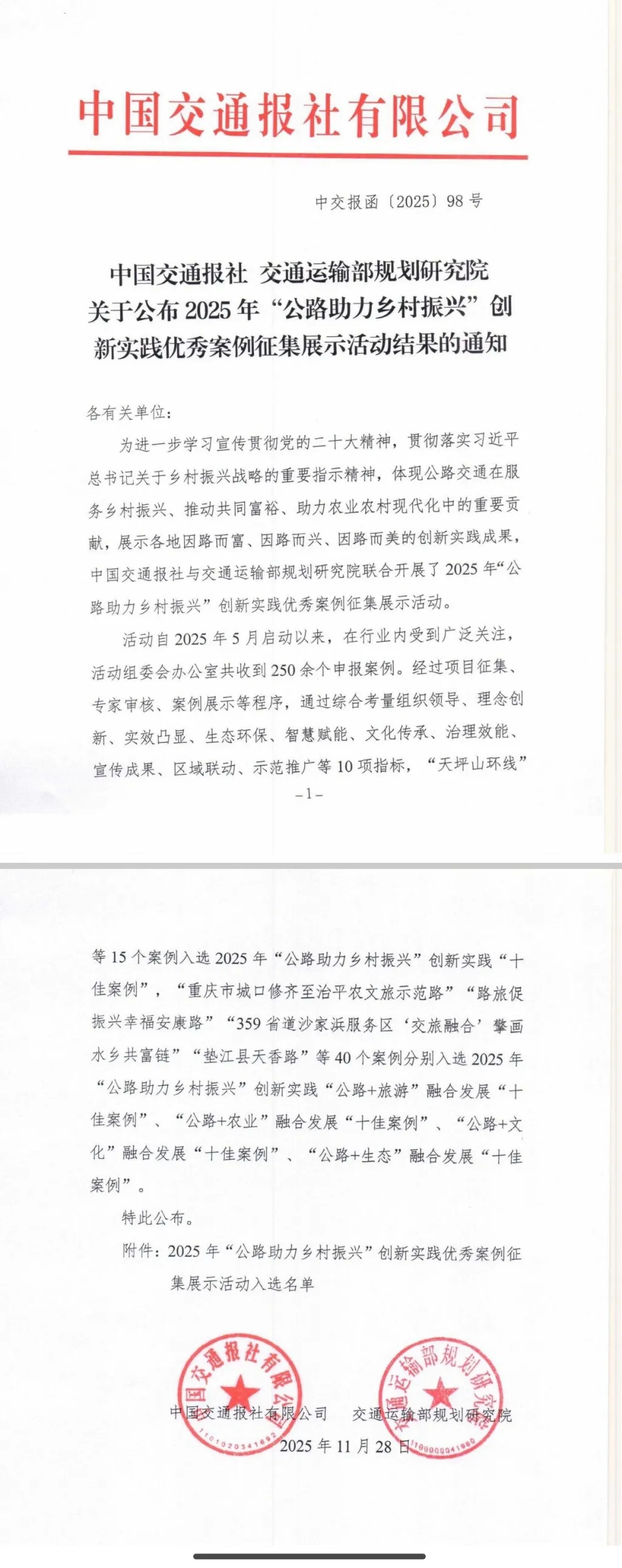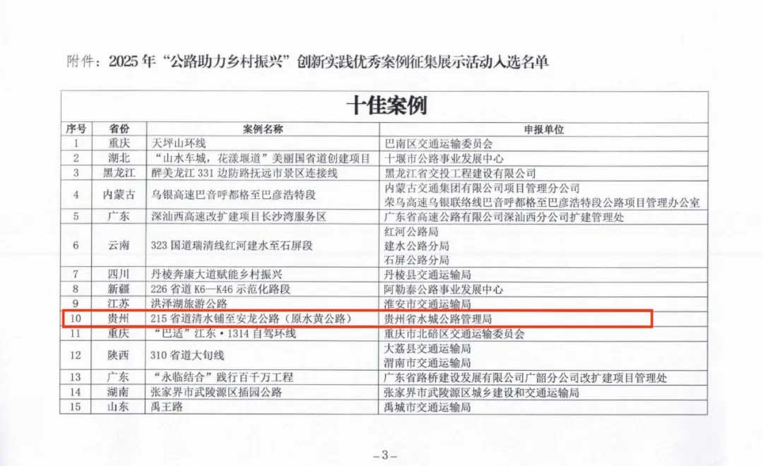 喜报!水城公路管理局《215省道清水铺至安龙公路(原水黄公路)》入选2025年“公路助力乡村振兴”创新实践优秀案例“十佳案例”