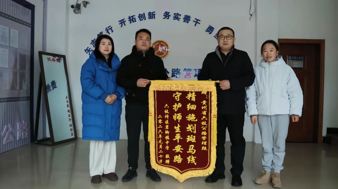 近日,六枝特区岩脚镇中学向六枝公路管理段送来“精细施划斑马线 守护师生平安路”锦旗,对该段在校园周边施划斑马线、完善安全防护设施的举措表示感谢。