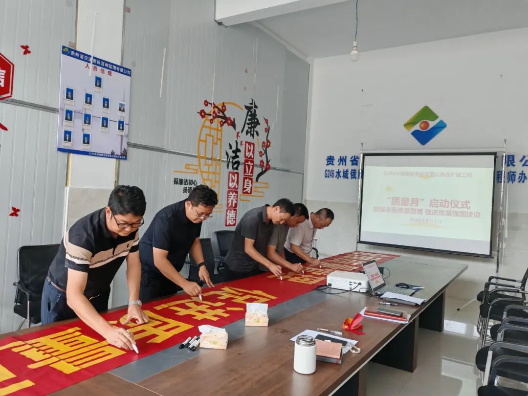 G246水城俄脚至姬官营工路改扩建工程项目业主办以9月质量月为契机,围绕 “加强全面质量管理促进质量强国建设” 主题,在总监办举行 9 月质量月活动启动仪式,并在工程项目部、沿线挡墙、施工区域等重点区域,集中悬挂质量安全主题横幅。组织检查小组对项目开展“拉网式” 检查,重点聚焦施工工序质量、安全防护措施、设备使用管理、人员操作规范等关键环节。将质量安全管理贯穿项目建设全流程,为工程建设保驾护航。