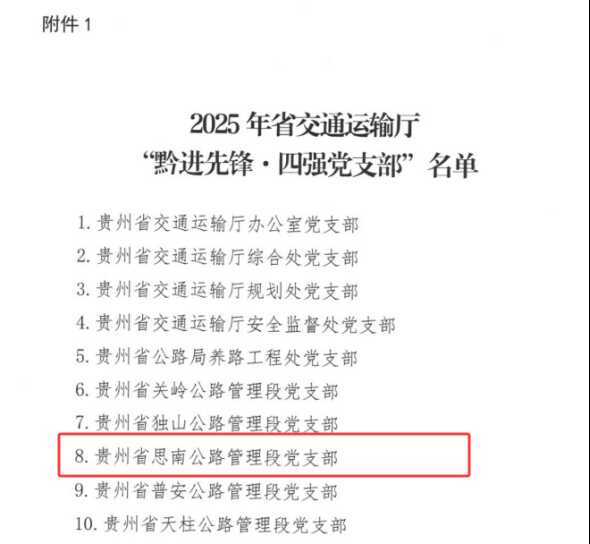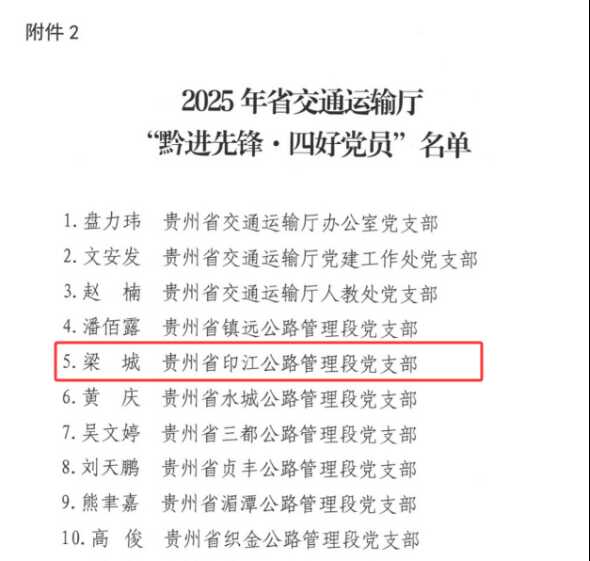 近日,省交通运输厅党委印发《关于命名2025年省交通运输厅“黔进先锋·四强党支部”和“黔进先锋·四好党员”的决定》,贵州省思南公路管理段党支部荣获2025年省交通运输厅“黔进先锋·四强党支部”,梁城同志(贵州省印江公路管理段党支部)荣获2025年省交通运输厅“黔进先锋·四好党员”。