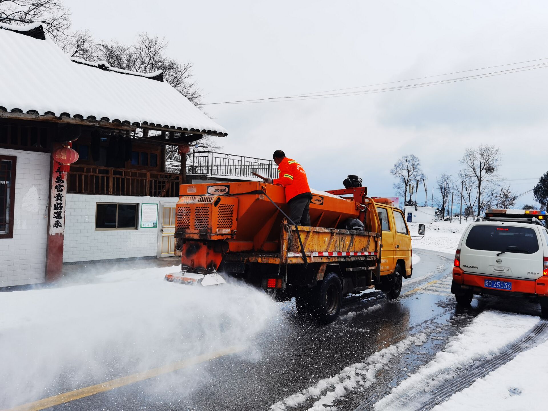 风雪越大,我们越要向前冲,因为每条路上都有等待归家的目光,这是刻在抢险队员骨子里的信念。每当冬季寒潮裹挟着冰雪侵袭石阡时,境内国道354线、国道211线、省道203线易凝冻路段便会面临结冰风险。2023年冬天,寒风凛冽的公路上,风如刀割般刮在脸上,抢险队员们却已身着反光背心,扛起铁锹,驾驶着撒布机奔赴易结冰路段。在国道354线K1194+000-K1197+000处,路面结冰厚度可达1厘米,车辆稍不注意就会打滑。队员们分成3个小组,一组沿着公路设置警示标志,一组驾驶撒布机在前方撒融雪剂,一组手持铁锹在后方辅助清理,确保过往车辆、行人能够安全通行。“应急抢险队”在结冰路面上开辟出一条条安全通道,让滞留的车辆顺利通行,让返乡的群众平安到家。