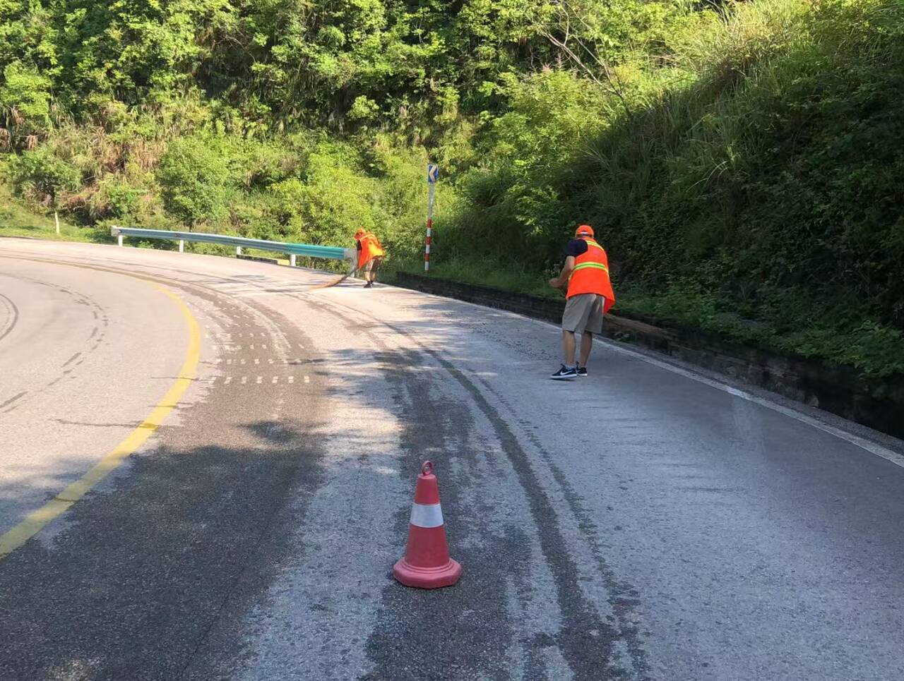 遇到难以清扫的顽固污渍,比如路面上的油污、水泥渍,“清洁卫士”也有自己的办法。2025年6月17日,在国道211线K2077+150处,一辆装载砂石材料车辆转弯时侧翻,砂石材料倾覆,机油洒漏在路面,影响行车安全。“清洁卫士”立即赶往现场,按规范设置警示标志标牌,提醒过往车辆减速慢行,及时清理占道砂石材料,面对难以清理的油污,“清洁卫士”采用洒布细沙的方式进行处置,经过2小时的仔细清理,路面终于恢复了干净整洁。