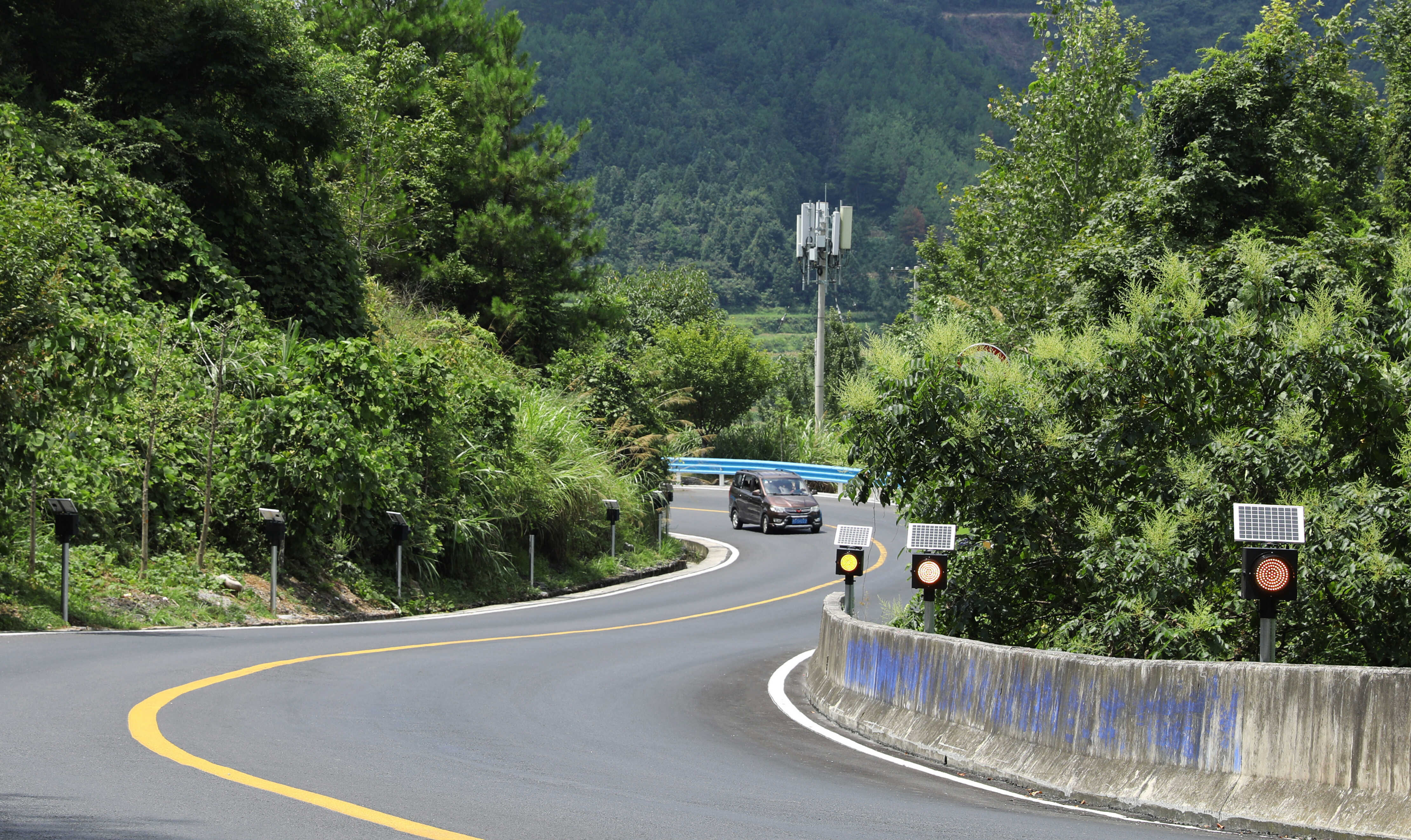 “路面改造完成后,我们按照‘精准选址、智能适配’原则,在急弯多雾路段加装了太阳能雾灯系统。雾灯发出的黄色闪烁灯光穿透性强,射程超500米,穿透力是普通信号灯的3倍,因为采用了同频控制技术,所有雾灯同步闪烁,形成一道清晰的警示线,能够引导驾驶员精准预判道路线形变化。”松桃公路管理段养路工程股副股长何林烨说。