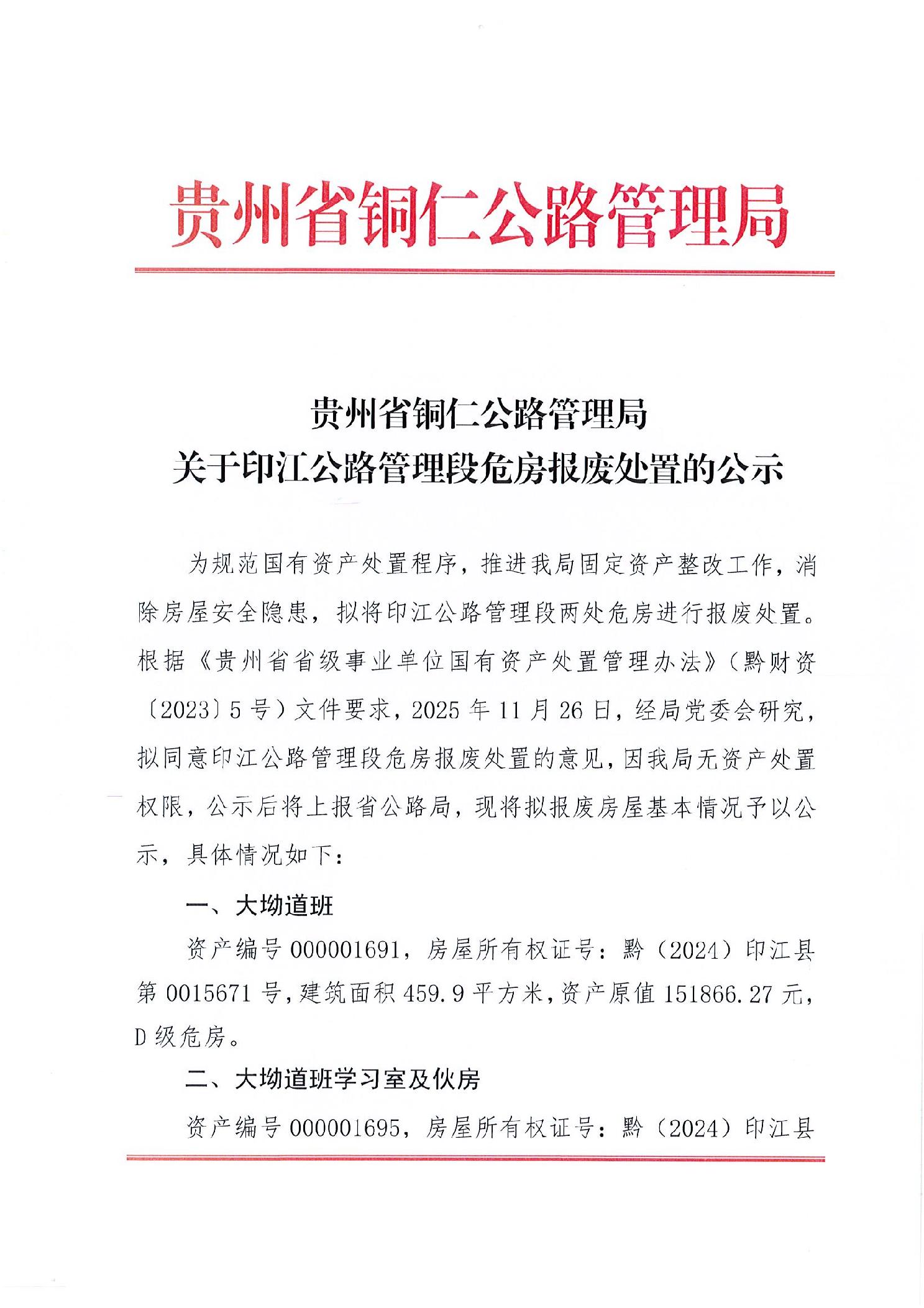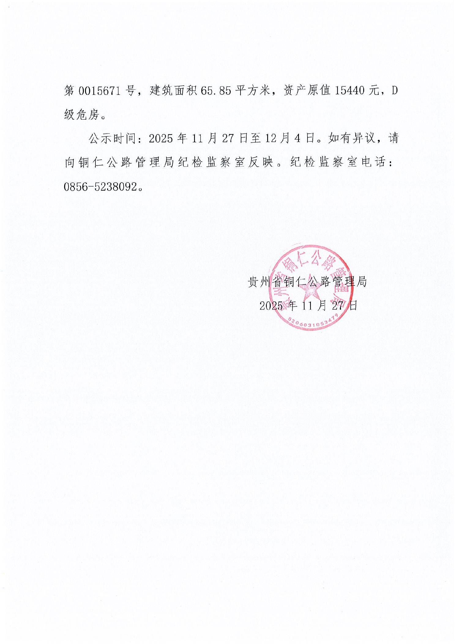 铜仁公路管理局关于印江公路管理段危房报废处置的公示