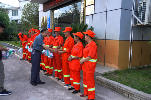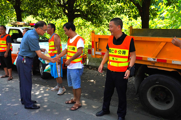 来到玉屏段管养的201省道及320国道,慰问组立即向养护职工发放了毛巾、防暑药品、沐浴露、花露水等慰问品,并与他们亲切交谈,姚建勇高度赞扬了他们在高温天气下仍然坚守岗位、默默付出的奉献精神,并嘱咐他们在保障管养公路畅通整洁的同时,一定要合理调整作业时间,注意自身安全和健康防护,劳逸结合,以良好的身心状态投入到工作中。
