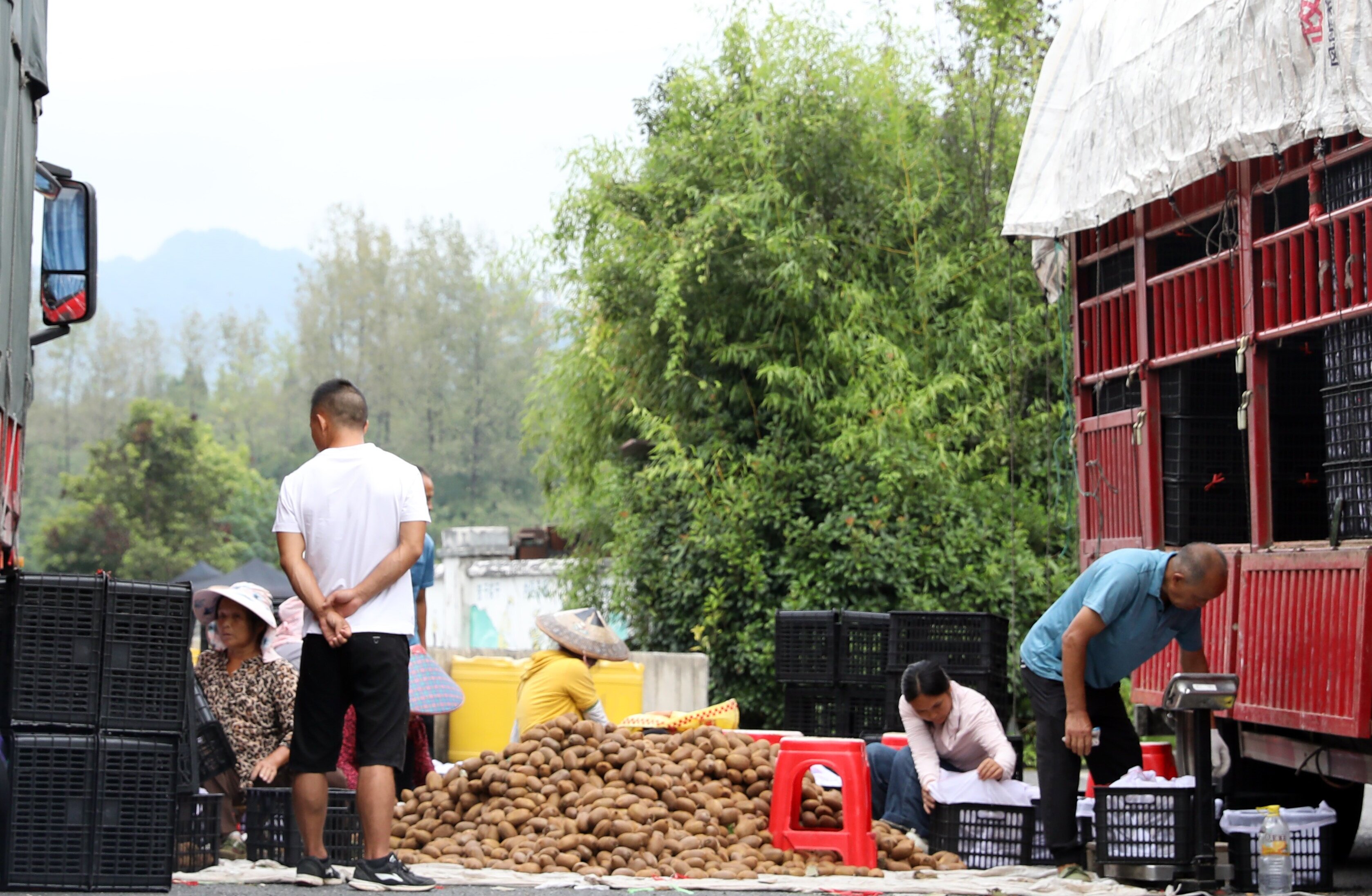 国道352线旁,与一处猕猴桃种植基地隔路相对的孟溪户外劳动者综合服务站内,一群工人正在进行拣果装车,一筐筐新鲜的猕猴桃整齐地码放在车厢里。
