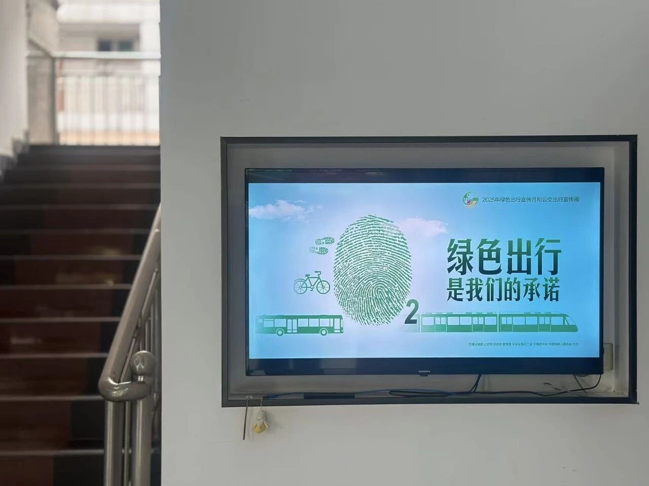 桐梓公路管理段在段机关办公楼播放绿色出行宣传月和公交出行宣传周海报。(陈诺)