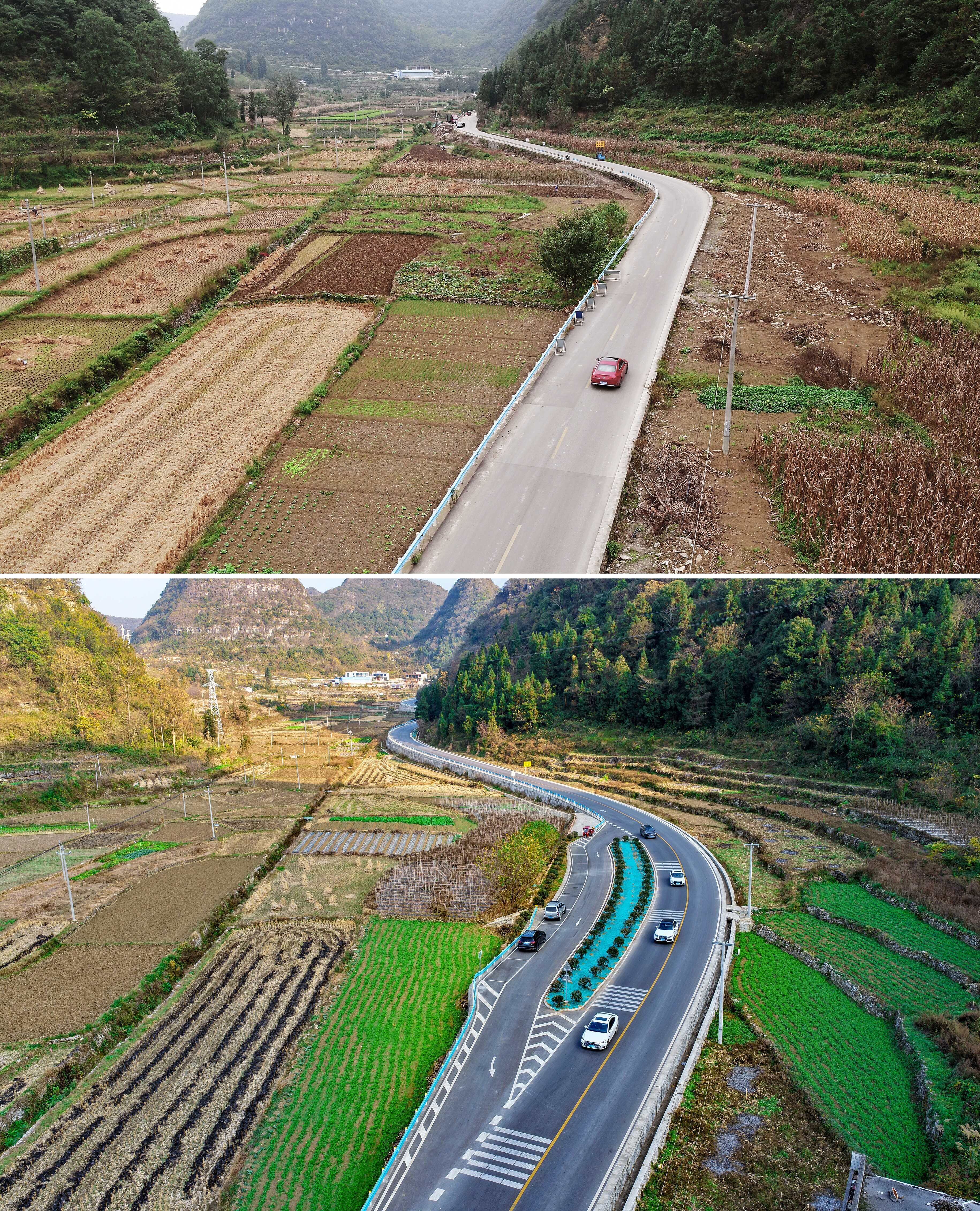 当镜头跨越时光的沟壑,将公路改建前后的画面并置同框,安顺市G356大落线的蜕变轨迹,亦是一方区域发展的生动注脚。在旧路影像里,更多是承载着基础通行需求,而改扩建后的新貌则全然不同,平整宽阔的沥青路面如黑色绸缎般延伸向远方,清晰的交通标线与完善的防护设施为安全护航,拓宽的车道让车流行驶更为顺畅,道路两侧精心规划的绿化景观与配套设施相得益彰,勾勒出一幅“人在车中坐 车在画中行”的美好画卷。