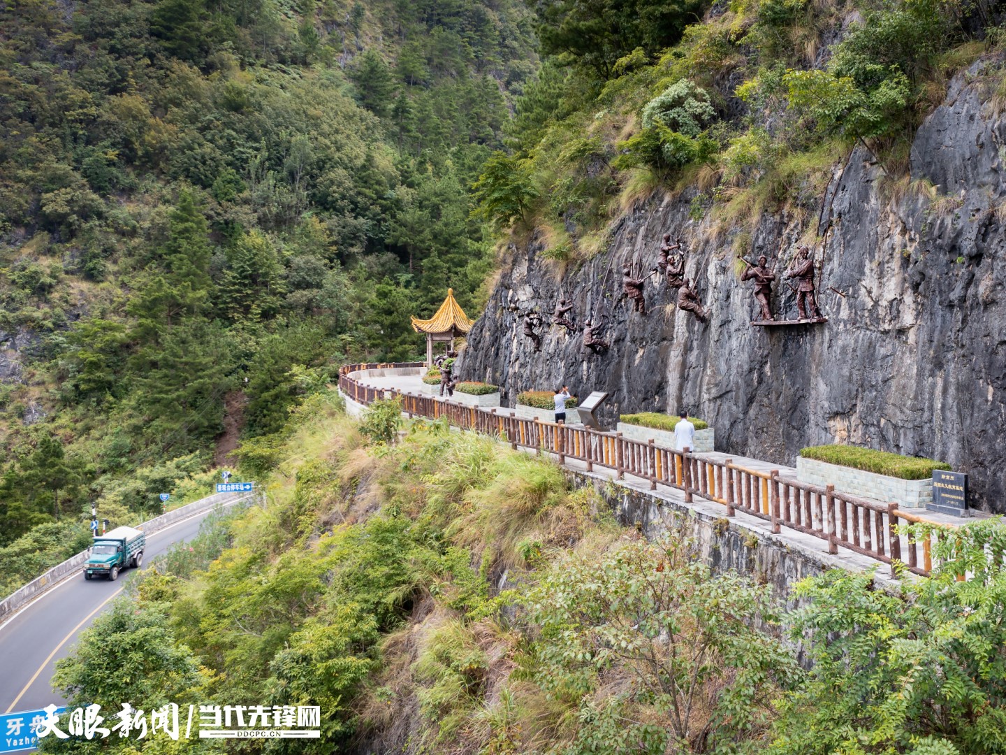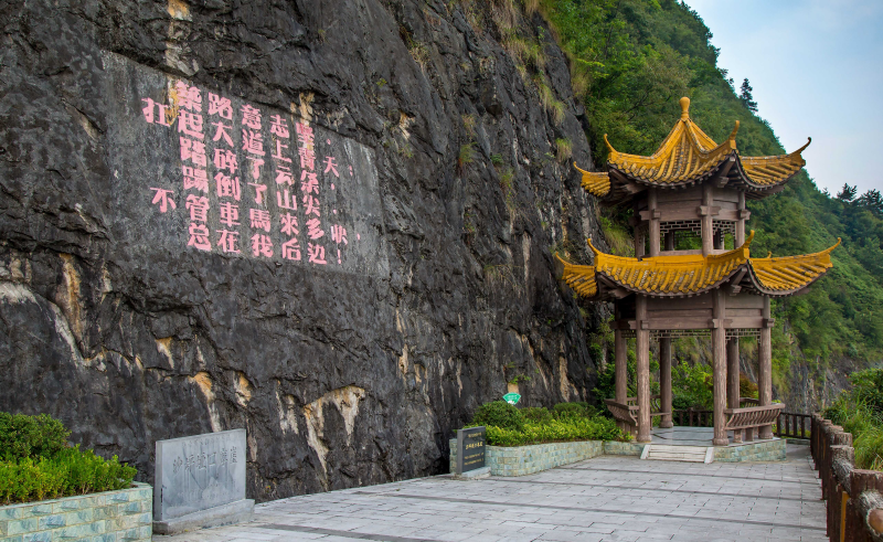 在贵州省平塘县国道G552线公路边的沙坪垭口山崖绝壁上,有两块摩崖石刻静默矗立。虽风雨侵蚀了岩石,却未曾磨灭镌刻其上的34个大字:筑路意志坚,扛起大道上青天;踏碎了云朵,踢倒了山尖,不管车马来多快,总在我后边!它们像是一把解码钥匙,豪情诉说着上世纪50年代那段火热的筑路岁月……