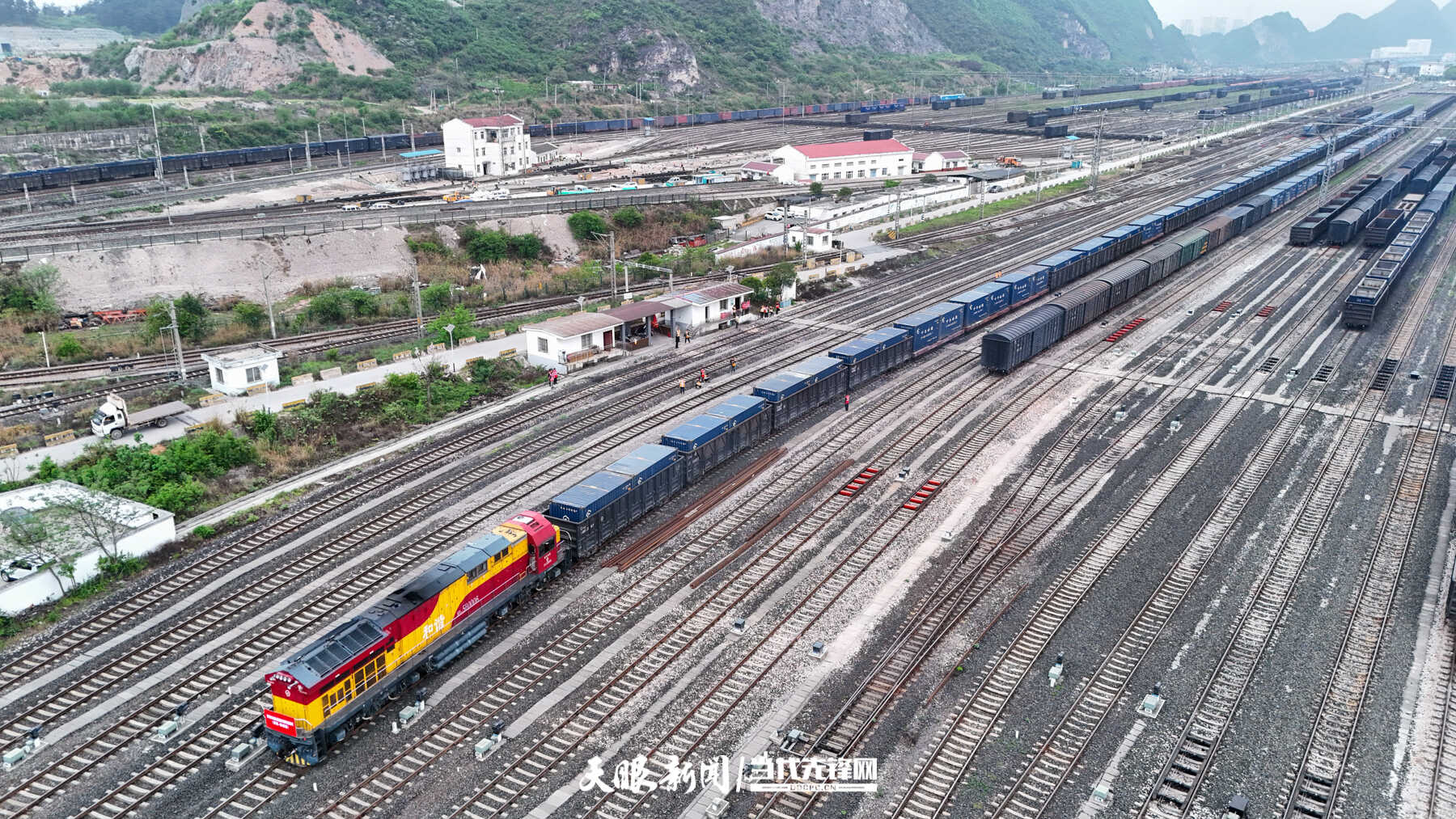 2025年4月15日,一列满载2688吨化肥的铁海联运班列,从贵阳南站编组场内鸣笛启程,驶向广西北部湾港(防城港)。龙建睿 摄