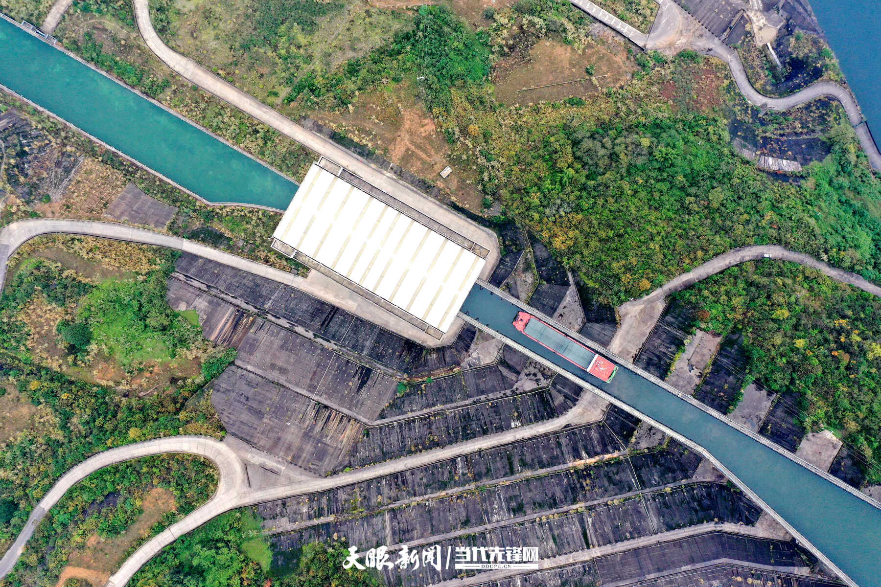 2021年11月17日,一艘货轮行驶在乌江构皮滩水电站通航工程第一级升船机和第二级升船机间的明渠水面(无人机照片)。代鑫 摄